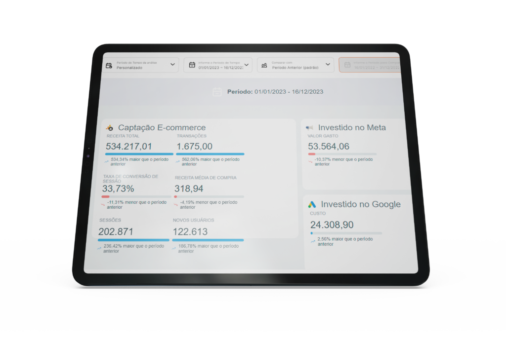 Nossos clientes de E-commerce contam com dashboards detalhados e atualizados em temo real para acompanhamento das principais métricas da operação. Como esse cliente que no ano de 2023 investiu pouco mais de R$70 mil e faturou MEIO MILHÃO!