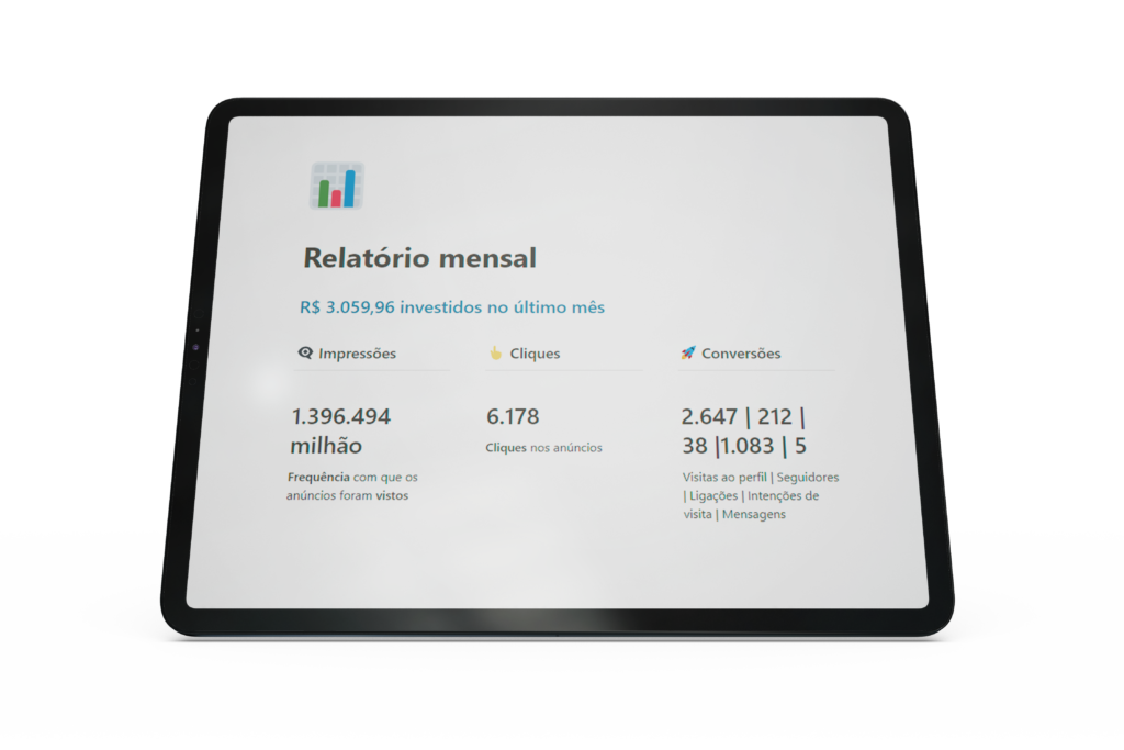 Receba feedbacks mensais sobre ajustes e resultados, bem como relatórios mensais de investimentos e retorno, para saber como os anúncios estão performando e mapear sobre seu investimento.